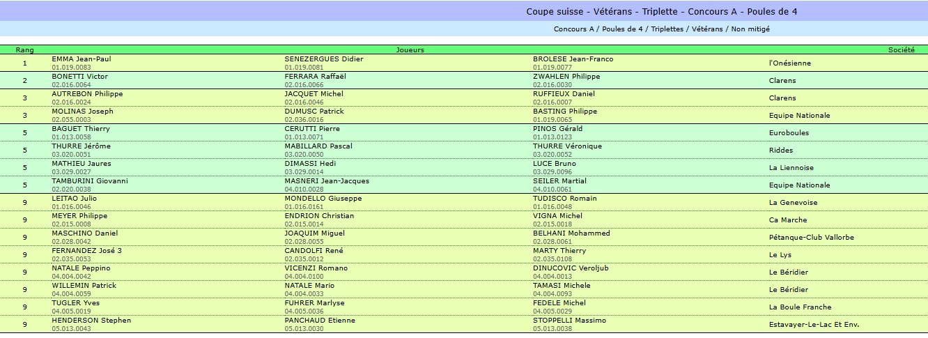 Coupe suisse - Vétérans - Triplette - Concours A - Poules de 4